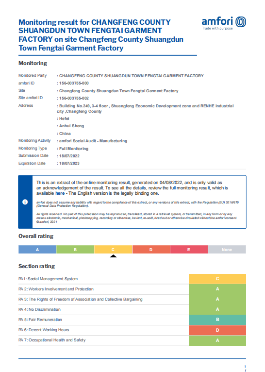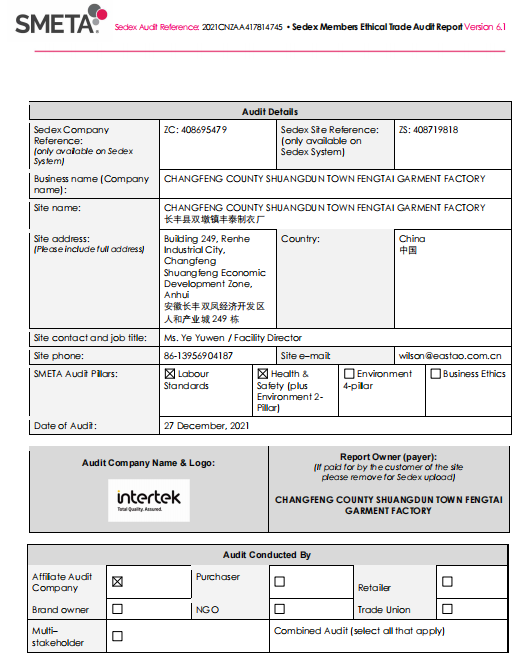 Hefei Fengtai Garment Factory, as a shareholding factory of Hefei Eastao, has?variety of Audit certification of Code of Conduct as BSCI/SMETA/COSTCO and?Disney as well.